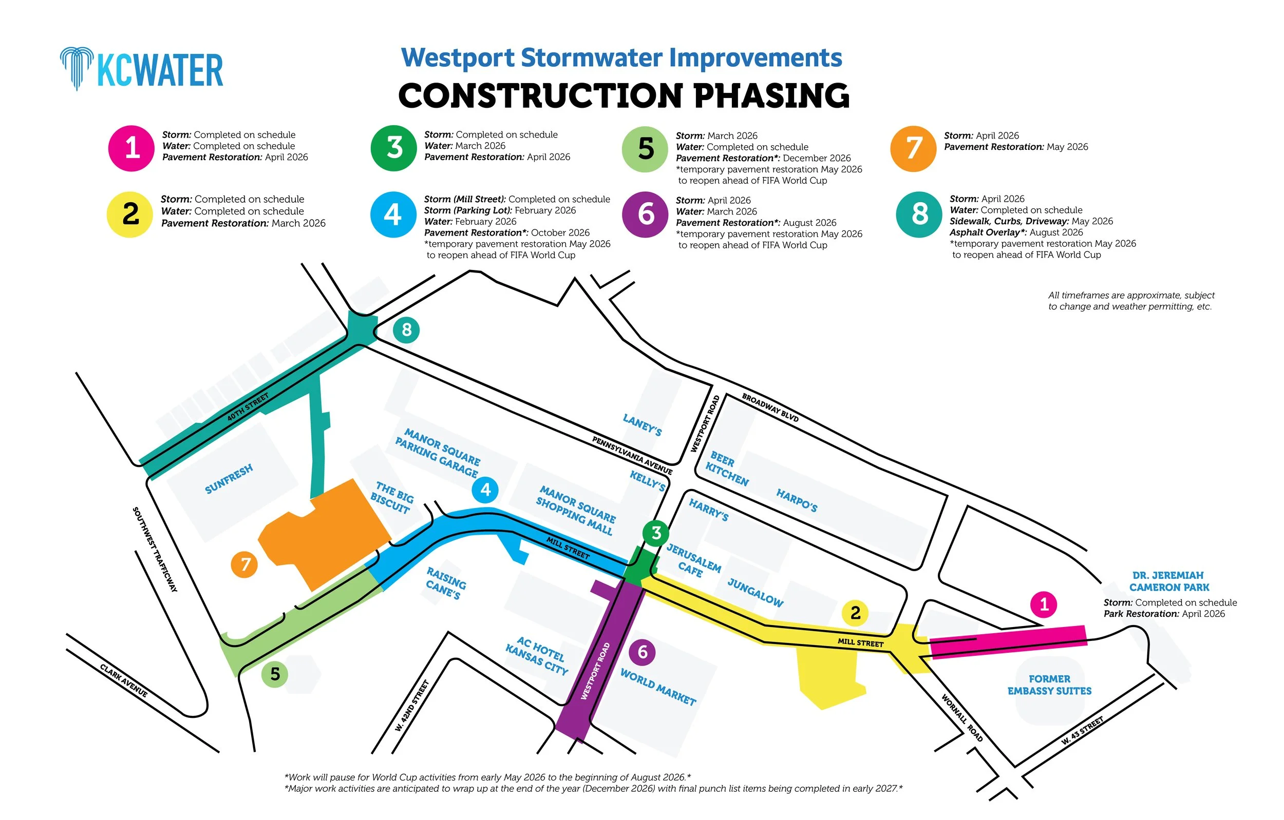 Underground structures will add 3.5 million gallons of stormwater storage at the Mill Street Station parking lot and Dr. Jeremiah Cameron Park. Increasing the underground water storage capacity will help mitigate frequent flooding issues in Westport. Stormwater improvements also include a new dedicated storm sewer in Mill Street and Westport Road, as well as roadside green stormwater infrastructure to improve drainage and reduce burden on the existing combined sewer system. The City is investing in other public improvements in the area to maximize the investment and avoid future disturbance needs to replace aging infrastructure which include:
